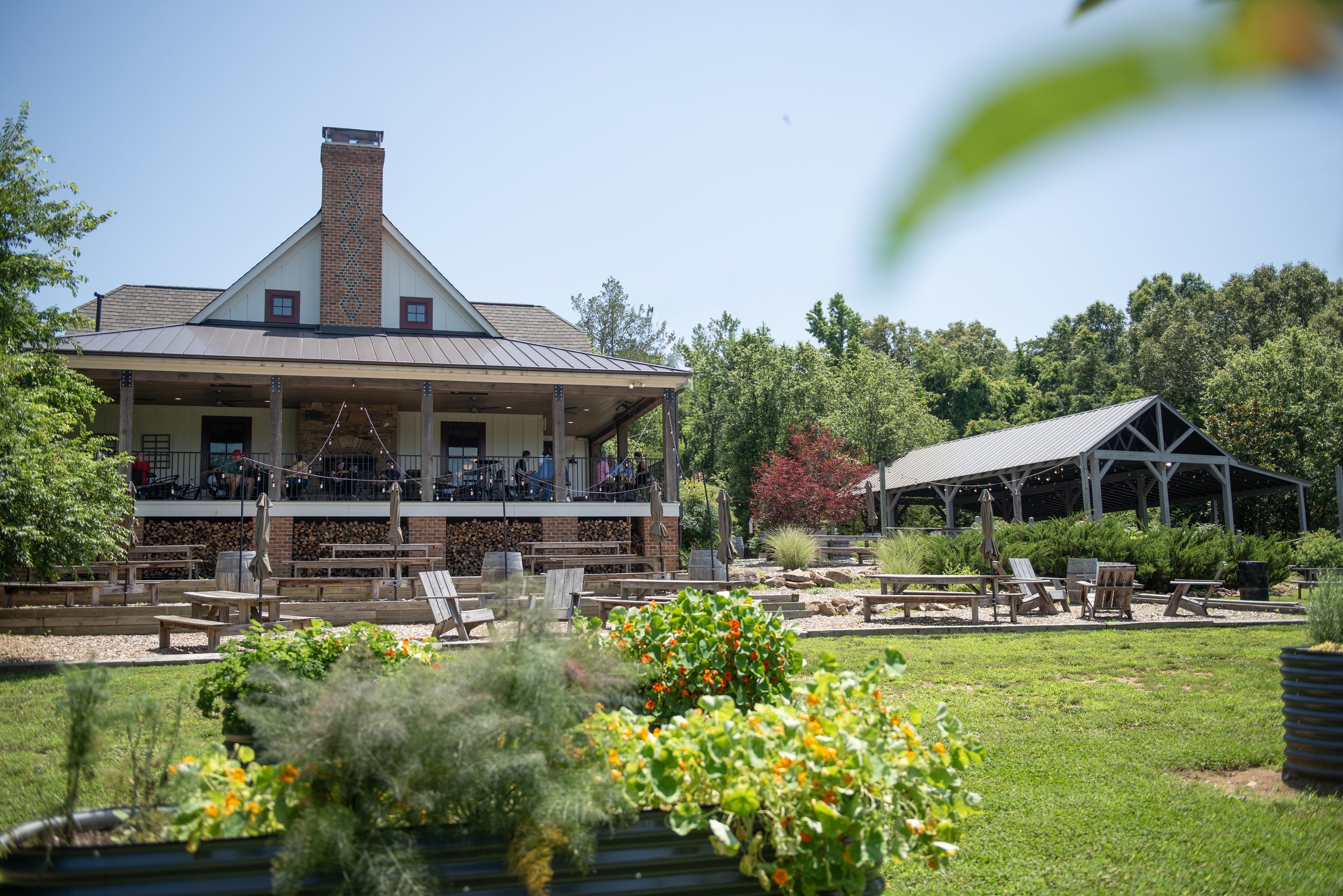 Covered outdoor pavilion in the beer garden and a rustic indoor taproom